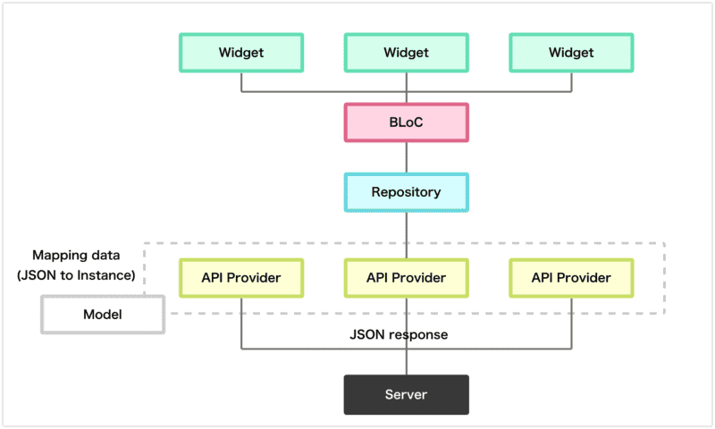 - BLoC 状態管理クラス。Repositoryからデータを取得し、データ加工後Streamに流して状態を更新する。Widgetにおいては、BLoCから流れたデータをキャッチして該当箇所が再描画される。Screen(Widgetの集まり)毎にBLoCが存在するイメージ。