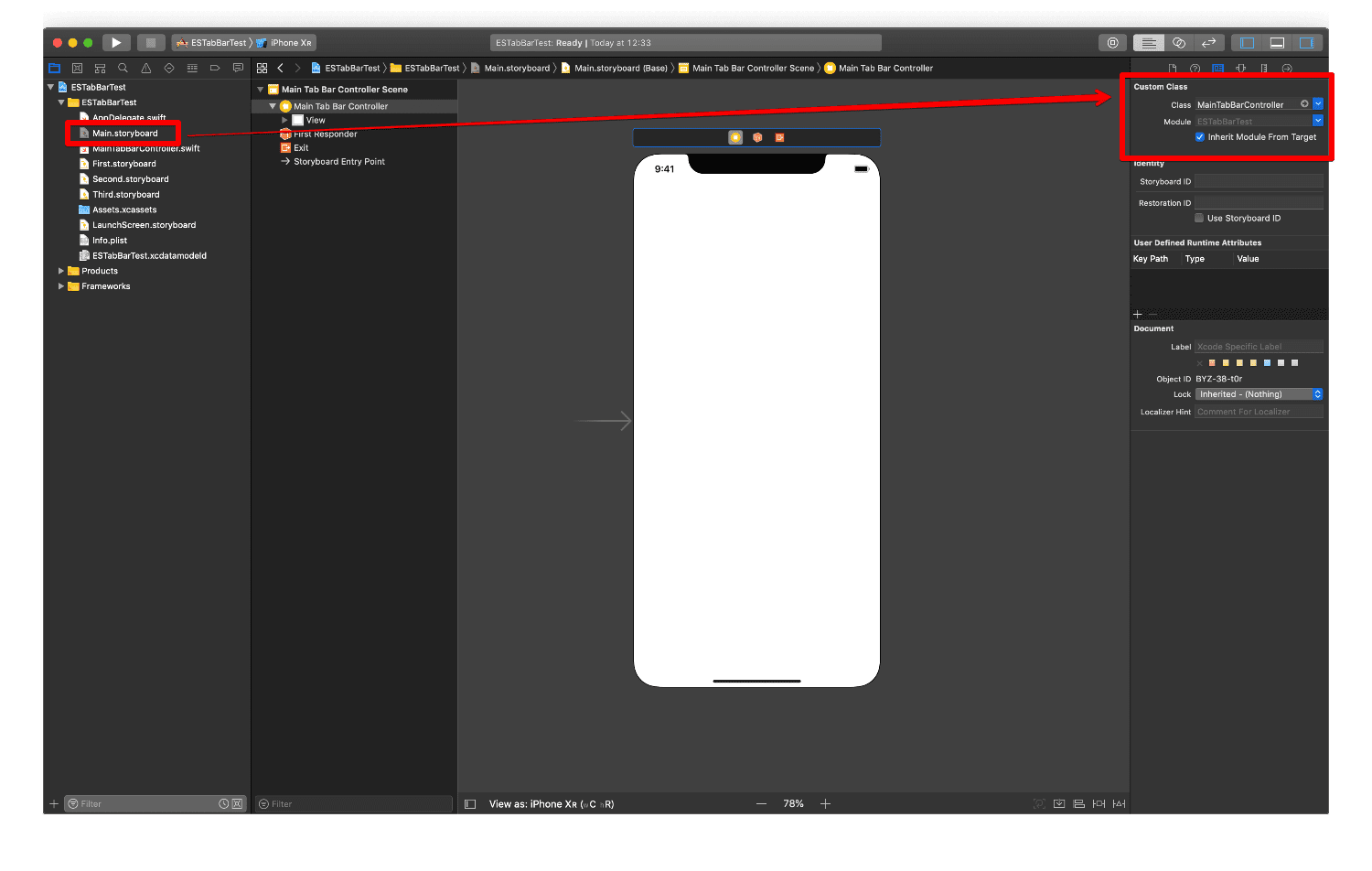 はじめに「MainTabViewController.swift」を作成し、Main.storyboardのinitialViewControllerにアタッチします(デフォルトの「ViewController.swift」はいらないので削除)。