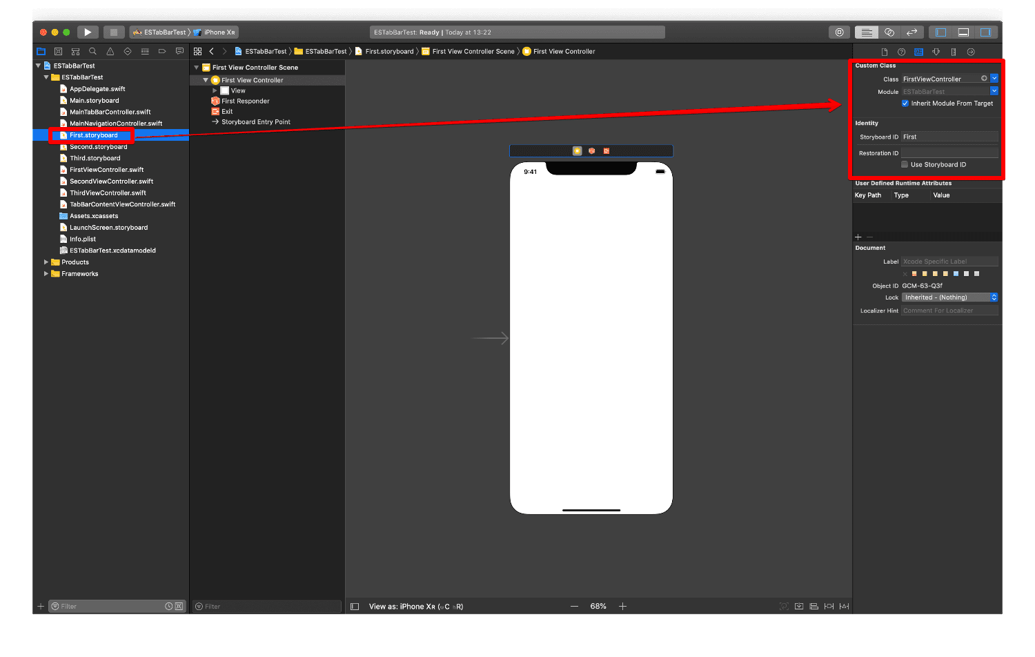 続いて、First.storyboardとSecond.storyboardとThird.storyboardについて、UIViewController(例:FirstViewController等)を作成+initialViewControllerの設定を済ませ、Identity inspectorの[identity]内、[Storyboard ID]をそれぞれFirst,Second,Thirdとしておきます。