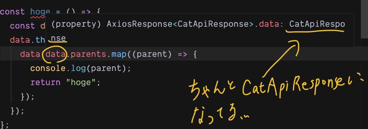 けど、実際はnullかもしれないし、 CatApiResponse のinterfaceに則したデータ構造じゃないかもしれない。で、実際に変なデータを返すAPIを用意して実行すると、案の定 data.data.parents.map() のところでコケる。でも、IDEにも怒られないし、コンパイル時にもツッコまれない。
