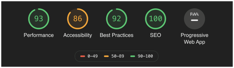 アクセシビリティは86だったが、基盤的な所で修正が必要な項目は特になかったので、ちょこちょこした所を修正して90台には載せたいと思う。