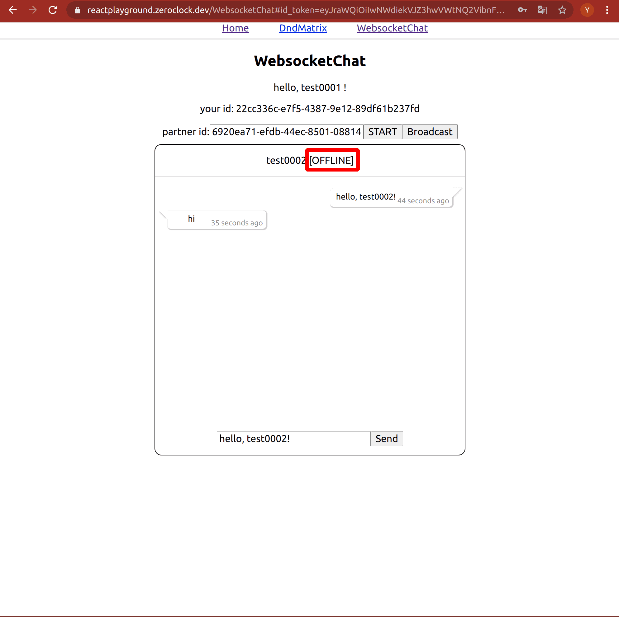 上記以外にも、切断後に再度ログインして相手IDを入力して再接続すると、過去のメッセージもきちんと再現してくれます(メッセージ情報の永続化)。